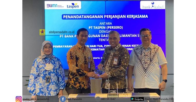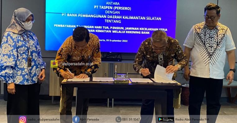 BANJARMASIN – Sebagai upaya meningkatkan kemudahan dan fasilitas bagi Aparatur Sipil Negara (ASN) di lingkup Kalimantan Selatan, Bank Kalsel melakukan penandatanganan kerjasama dengan PT TASPEN (Persero) untuk secara resmi menjadi mitra pembayaran manfaat Peserta Taspen. Meliputi pembayaran Jaminan Hari Tua, Pensiunan, Jaminan Kecelakaan Kerja dan Jaminan Kematian.