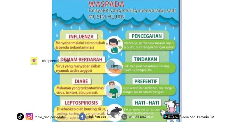 “Kami imbau warga agar waspada terhadap berbagai penyakit, di musim hujan, seperti Demam Berdarah, Influenza, ISPA atau Infeksi Saluran Pernapasan Akut, diare, serta penyakit kulit dan leptospirosis,” ungkap Ramadhan, kepada sejumlah wartawan, Jumat (31/10).