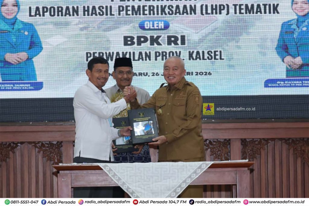 Banjarbaru – Gubernur Kalimantan Selatan, Muhidin, menerima Laporan Hasil Pemeriksaan (LHP) tematik kinerja dan kepatuhan Semester II Tahun 2025 dari Badan Pemeriksa Keuangan (BPK) Republik Indonesia Perwakilan Kalimantan Selatan, di Gedung Idham Chalid, Banjarbaru, Senin (26/1).