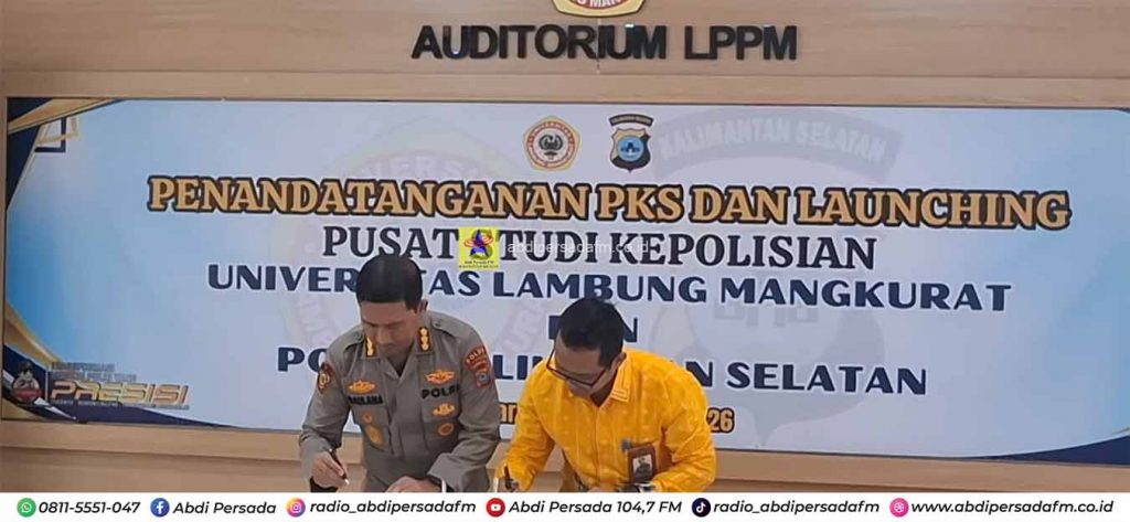 Banjarmasin – Dalam upaya memperkuat kolaborasi antara dunia akademik dan praktisi penegak hukum terus dilakukan, untuk menjawab berbagai tantangan yang semakin kompleks di tengah masyarakat. Hal ini diwujudkan melalui kegiatan penandatanganan Perjanjian Kerja Sama (PKS) sekaligus peluncuran Pusat Studi Ilmu Kepolisian, antara Polda Kalimantan Selatan dan Universitas Lambung Mangkurat (ULM) yang digelar di Banjarmasin, Rabu (11/3).