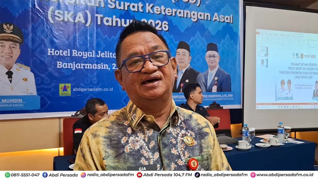 Banjarmasin – Dalam rangka memperlancar dan memperkuat arus ekspor, Dinas Perdagangan Kalimantan Selatan menggelar Focus Group Discussion (FGD) Fasilitasi Penerbitan Surat Keterangan Asal (SKA) tahun 2026, di salah satu hotel Berbintang Banjarmasin, Kamis (23/4).